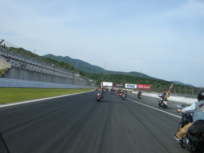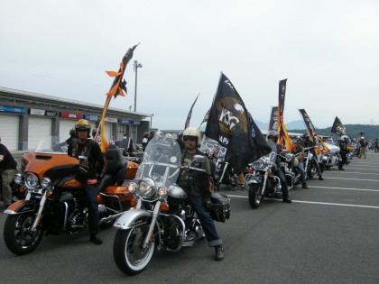 日ごろからハーレーを介してツーリングを楽しむ亀戸の「東東京チャプター」の仲間も、全国から集まったハーレーオーナーとチャプターパレードへ参加。自慢の愛車にのぼりをなびかせてレーシングコースを駆けます。