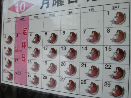 営業日を表わす鯛印のアイデアとユーモアセンス。店休日は月曜だ。