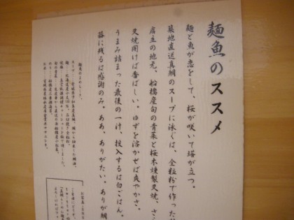 ハーレーダビッドソン亀戸から、このラーメン・麺魚まで徒歩10分余りかかる。この間、何軒のラーメン店を通り過ぎるだろう。来店を呼び込む理由はひとつ「味」である。商売の極意とは何業であれ「味」を独自に持ち、その「味」が客に支持され繁盛する。この原理原則は昔も今も不変だ。