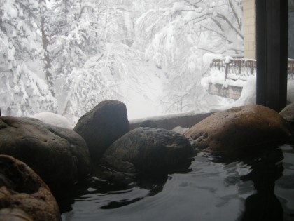 宿へ着いたのは午後2時前、まずは温泉へと向う。自在館は「お一人様」でも泊まれる。こんな平日なのに、新幹線・浦佐駅から8名のお客が一緒に宿へ。