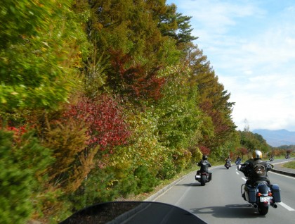 往路は関越自動車道から長野道を経由して中部横断自動車道の終点「佐久南IC」を出て女神湖へ。紅葉が美しく、また大きなコーナーが続く楽しいツーリングルートだ。