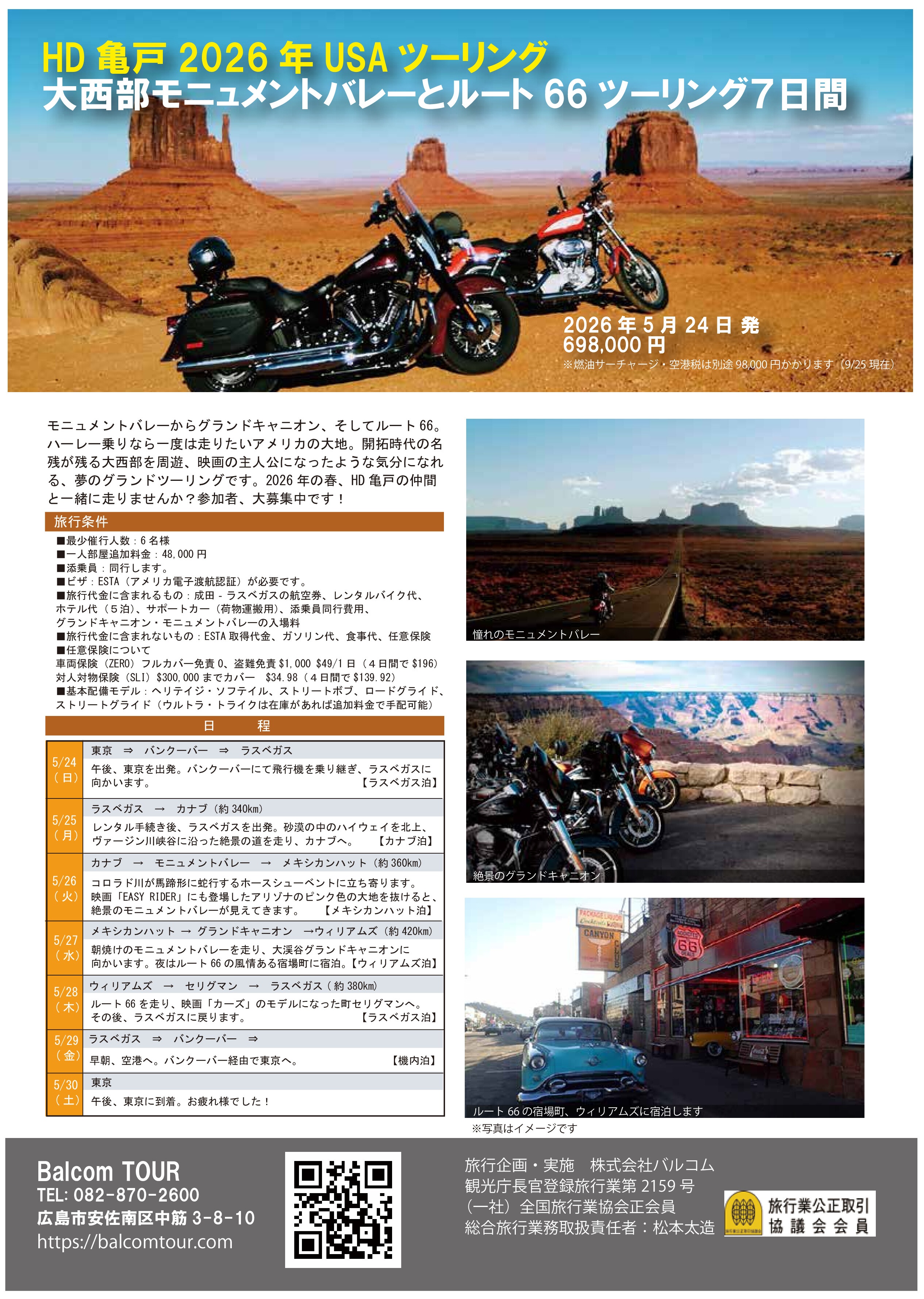 7年振りのハーレーダビッドソン亀戸主催「アメリカツーリング」を、来る2026年5月開催します! 出発 2026年5月24日 帰国 2026年5月30日